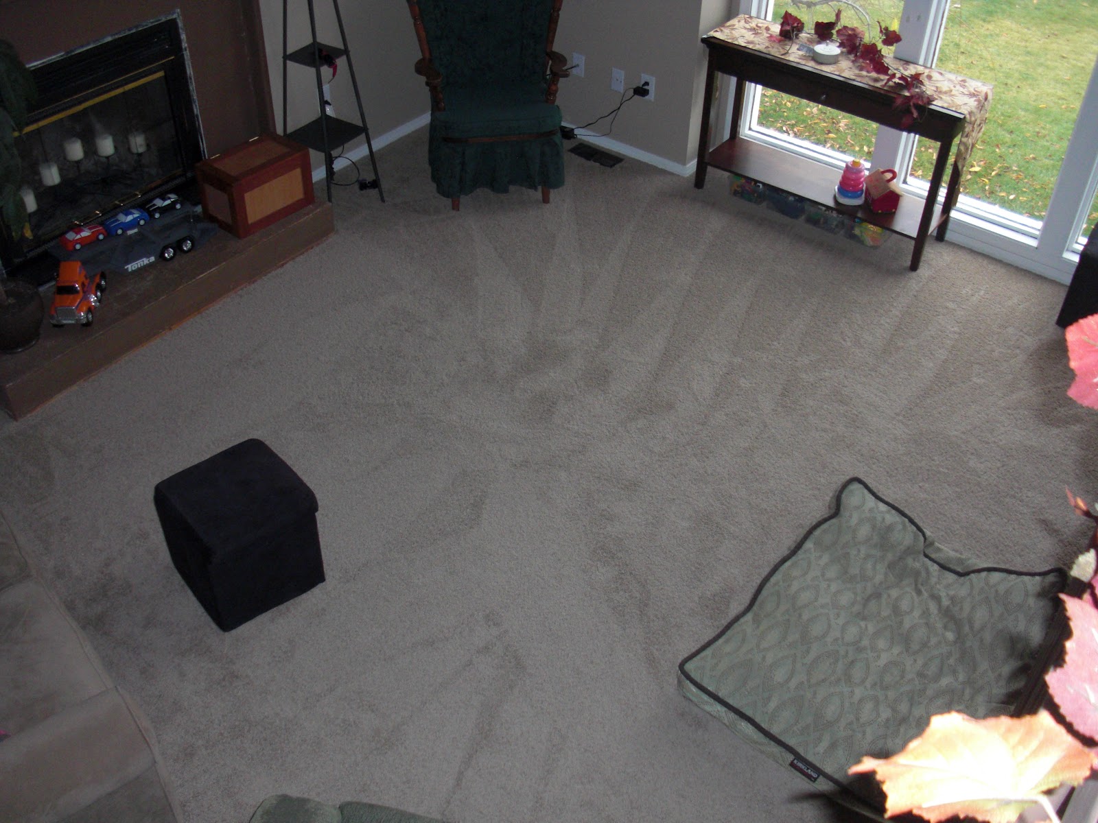 Since we moved into this house we have wondered what the heck the previous owners were doing? Not only did they have some interesting style choices but they also left us some interesting stains...GROSS. I have cleaned the carpets repeatedly, and tried to wear out my in-laws carpet cleaner. We've had it professionally cleaned, but in the end the stains came back, and our kids added new ones. The carpet was too light and too old to keep it up.